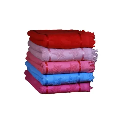 A stylish set of cotton towels in various vibrant colors, each piece featuring a woven star pattern and decorative stripes along the edges for an elegant finish.
