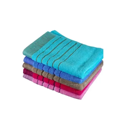 A set of cotton towels in various colors including light blue, dark blue, brown, red, and pink. Each towel features decorative stripes on one edge, adding a stylish touch.