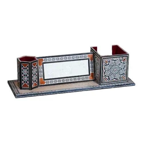 Add a touch of Oriental charm and the ancient history of Damascus to your workspace with this handcrafted Mosaic desk set (inlaid with wood and mother-of-pearl). A masterpiece that embodies the skill of ancestors and meets your daily needs with a royal flair.