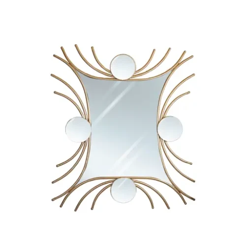 This mirror features an innovative geometric design that blends fluid lines with circular shapes. Surrounding the central rectangular mirror—which boasts elegantly curved edges—is an antique gold metal frame. Graceful metal strands radiate from the center like sunbeams or blooming flower petals. Four small circular mirrors are strategically placed on all four sides, giving the design a stunning visual balance and a character that merges Modern style with luxurious classics.