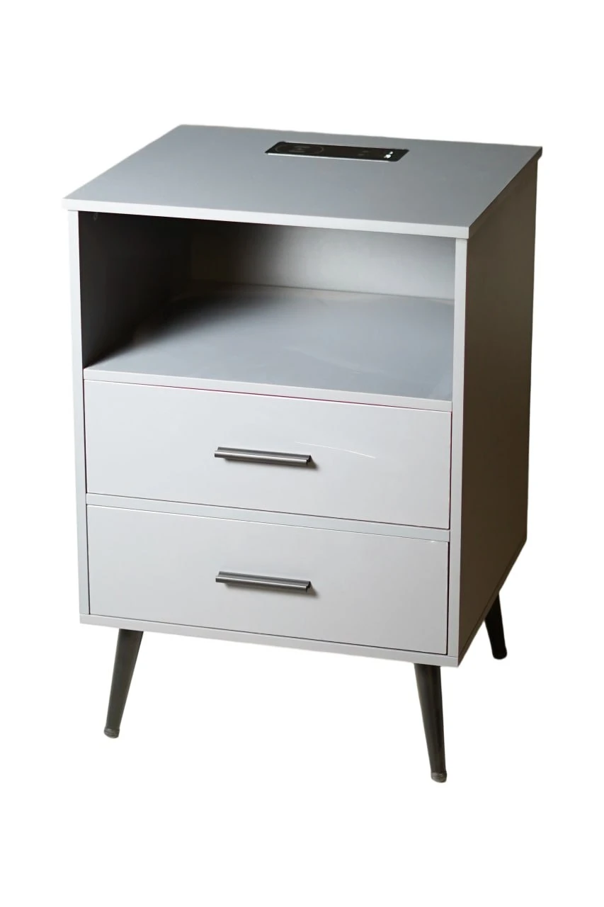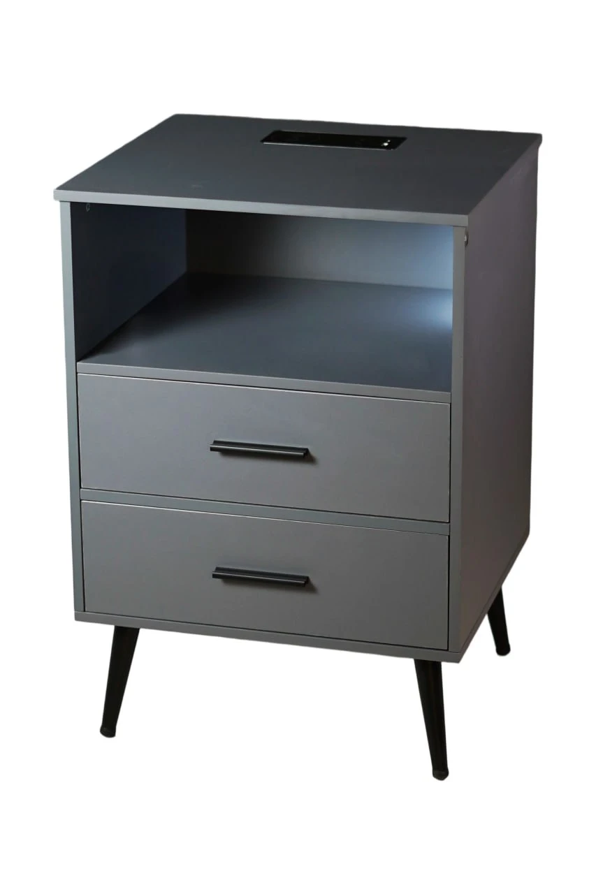 كومدينا بتصميم بتصميم انيق تحتوي على رف مفتوح في الاعلى ودرجين في الاسفل تحتوي الادراج على مقابض معدنية افقية واربعة ارجل مائلة ومدببة مزودة بقاعدة شحن مدمجة تستخدم بجانب السرير
