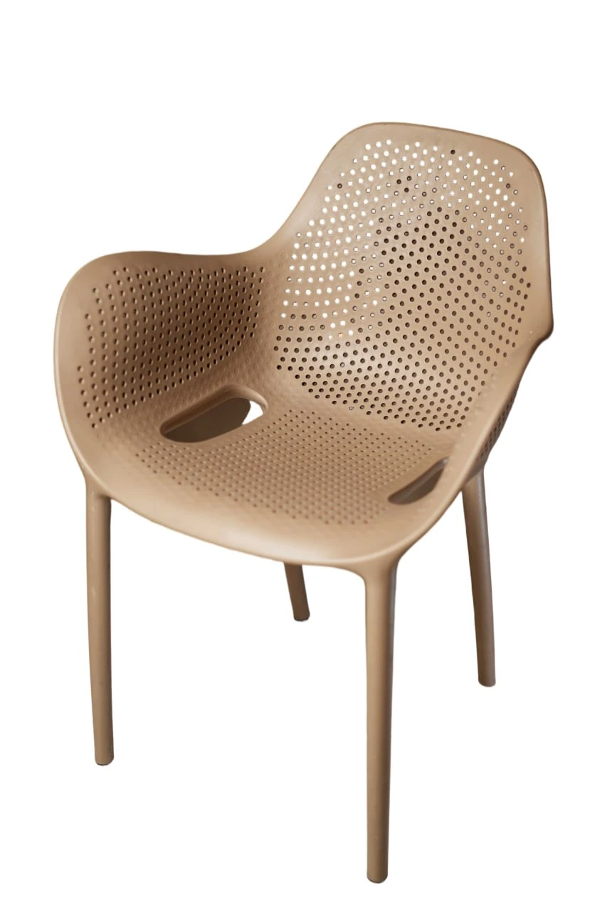 كرسي بلاستيك مصبوب بالكامل ذو تصميم حديث ومريح مصنوع من البلاستيك المتين والمقولب في قالب واحد يتميز بوجود ثقوب دائرية صغيرة للتهوية له شكل انسيابي مع مساند للذراعين مدمجة في هيكل الكرسي مناسب للاستخدام الداخلي والخارجي