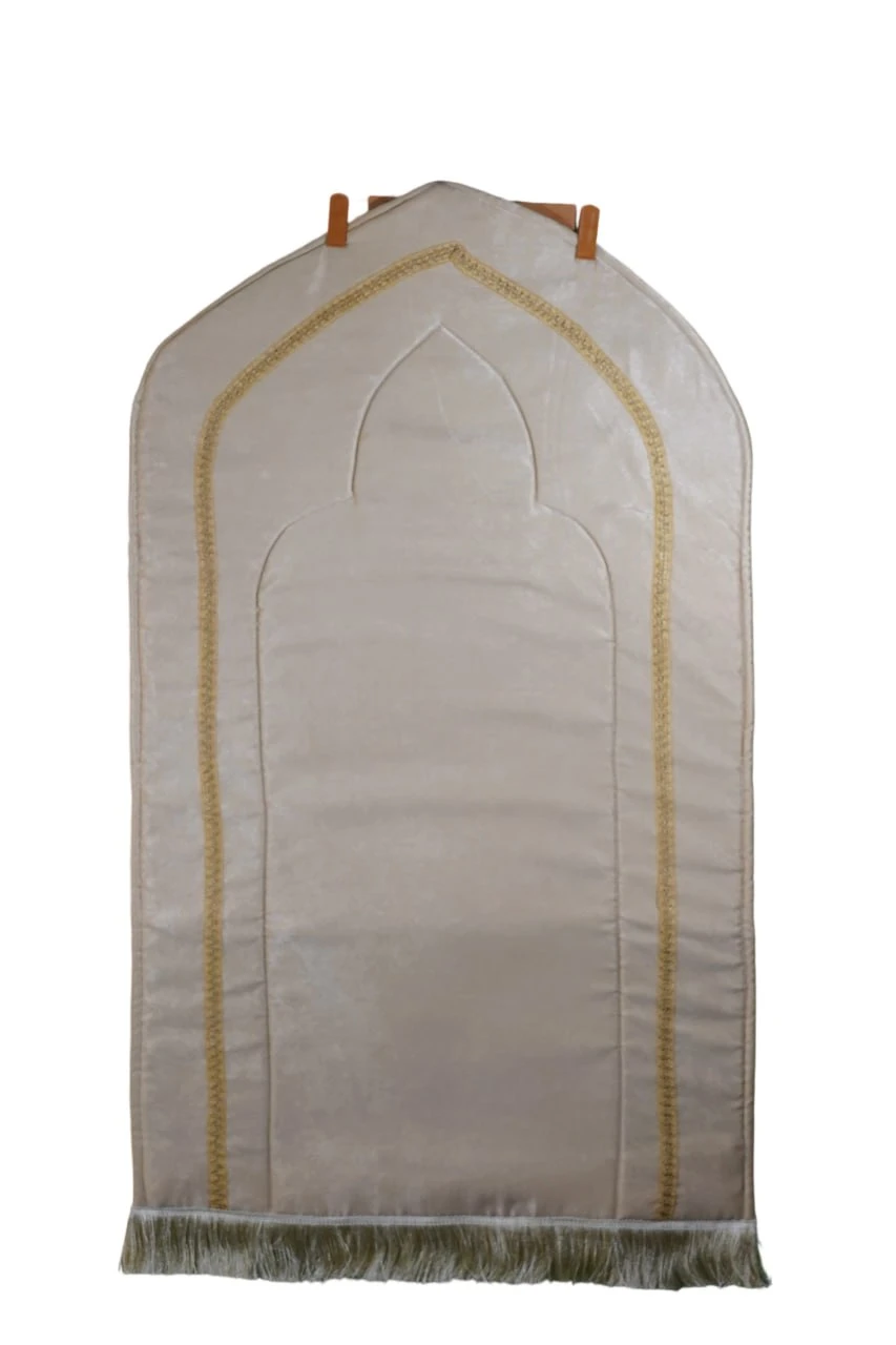 A collection of luxurious prayer rugs, made from soft velvet material, with elegant geometric patterns and designs that add a decorative touch. The rugs come in multiple colors including brown, beige, green, and gray-blue.