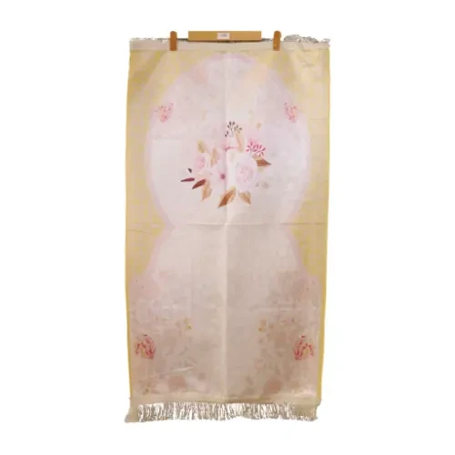 A prayer rug with an elegant design combining classic geometric patterns and colorful flowers.