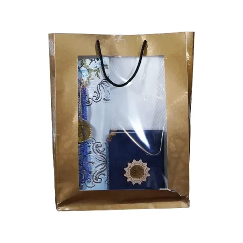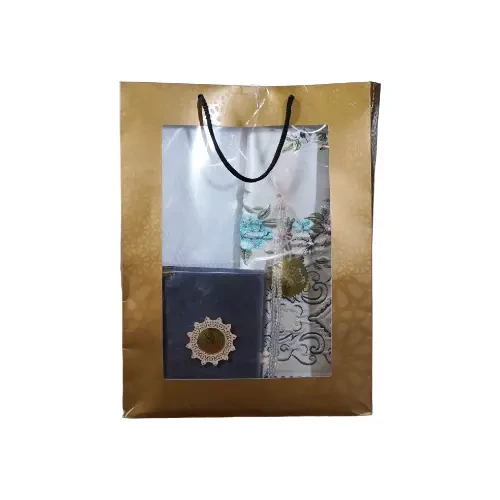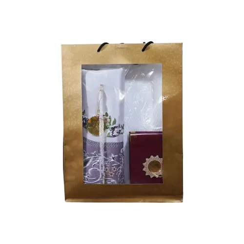 This set is a carefully curated collection of religious essentials, presented inside a premium golden gift bag featuring geometric Islamic patterns and a transparent window. The set includes: