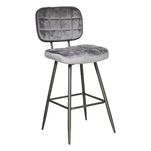 The stool features a high-quality velvet upholstery in a refined slate grey, offering a soft-touch texture that exudes luxury. The meticulously stitched quilted pattern on both the backrest and the seat provides a geometric depth, reminiscent of classic mid-century design updated for the modern era. The contrast between the rich fabric and the slender, matte black metal legs creates a visual harmony that complements a wide range of interior styles, from Art Deco to Contemporary Minimalism.