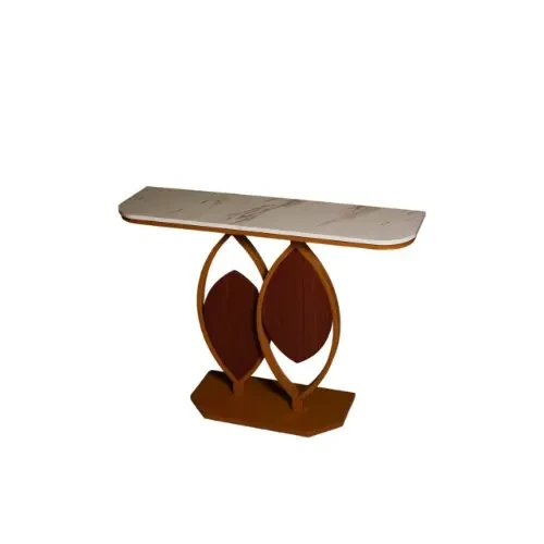 طاولة كونسول عصرية تتميز بسطح من الرخام الصناعي الفاخر الموشح بعروق رمادية ناعمة، ترتكز على قاعدة معدنية ذهبية مشغولة بدقة على شكل أوراق شجر تجريدية. يتوسط الأوراق لمسات خشبية باللون البني العميق لتخلق توازناً بصرياً مذهلاً بين الحداثة والكلاسيكية.