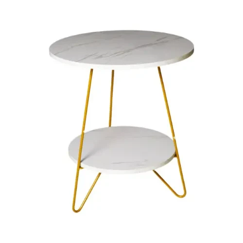 طاولة خدمة دائرية مكونة من طابقين، تتميز بسطح ذو مظهر رخامي أبيض مع تعريقات رمادية هادئة، مدعومة بهيكل معدني متين مطلي باللون الذهبي اللامع. صُممت بأبعاد مثالية لتناسب المساحات المختلفة دون أن تشغل حيزاً كبيراً.