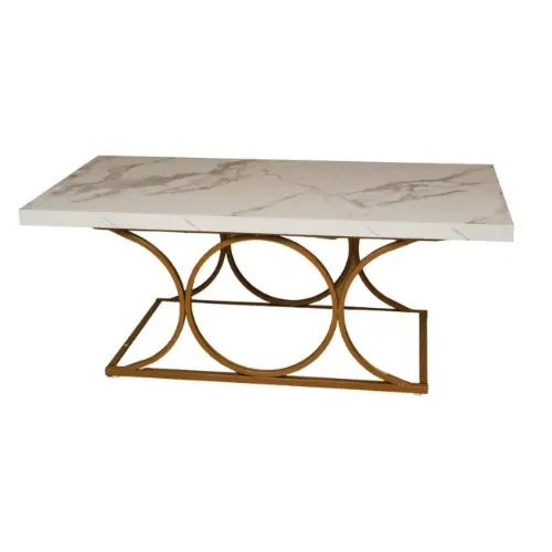 تخطف هذه الطاولة الأنظار بسطحها الذي يحاكي جمال الرخام الطبيعي بعروقه الرمادية الانسيابية التي تتداخل بانسجام مع اللون الأبيض النقي. يرتكز السطح على قاعدة معدنية مطلية باللون الذهبي اللامع، مصممة على شكل حلقات دائرية متداخلة تعطي إيحاءً بالخفة والاتساع، مما يجعلها قطعة ديكور استثنائية تضيف لمسة من "الأناقة الملكية" على أي مساحة توضع فيها.