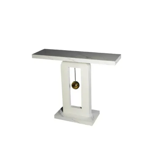 طاولة الكونسول بتصميم هندسي فريد يعتمد على التباين البصري المذهل. مصنوعة من أجود أنواع الرخام الأبيض الموشى بعروق رمادية ناعمة، وتتميز بقاعدة مستطيلة مفرغة يتوسطها بندول ذهبي مصقول، مما يمنحها طابعاً معمارياً يجمع بين القوة والنعومة.