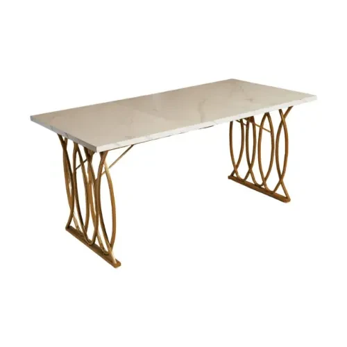 طاولة طعام مستطيلة تجمع بين صلابة الرخام الطبيعي وأناقة المعدن الذهبي. صُممت لتكون القطعة المركزية في غرفة الطعام، حيث تدمج بين الخطوط الهندسية المبتكرة والمواد عالية الجودة لتمنح منزلك طابعاً من الرقي الذي لا يتقادم.