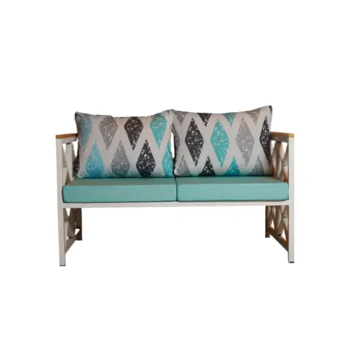 1. المقاعد: وسائد مريحة باللون التركواز الهادئ (Teal)، مصنوعة من قماش متين مخصص للاستخدام الخارجي.
