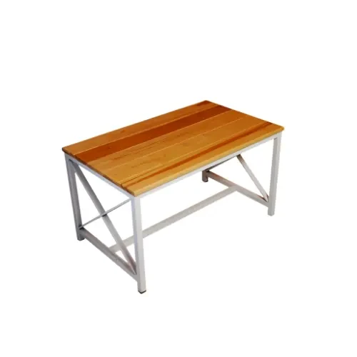 3. الطاولة: طاولة وسط مستطيلة بهيكل معدني أبيض وسطح خشبي يتكون من شرائح طولية، متناسقة تماماً مع تصميم الكراسي.
