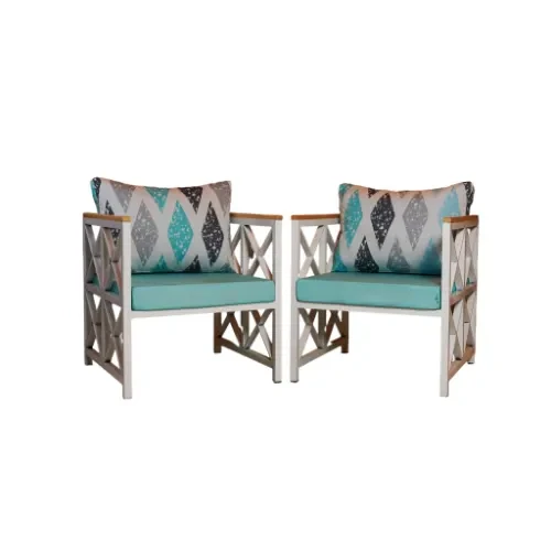 1. الإطار (Frame): هيكل معدني متين مطلي باللون الأبيض، يتميز بتصميم جانبي وخلفي على شكل حرف (X) متداخل، مما يمنح الطقم مظهراً فنياً وقوة هيكلية إضافية.